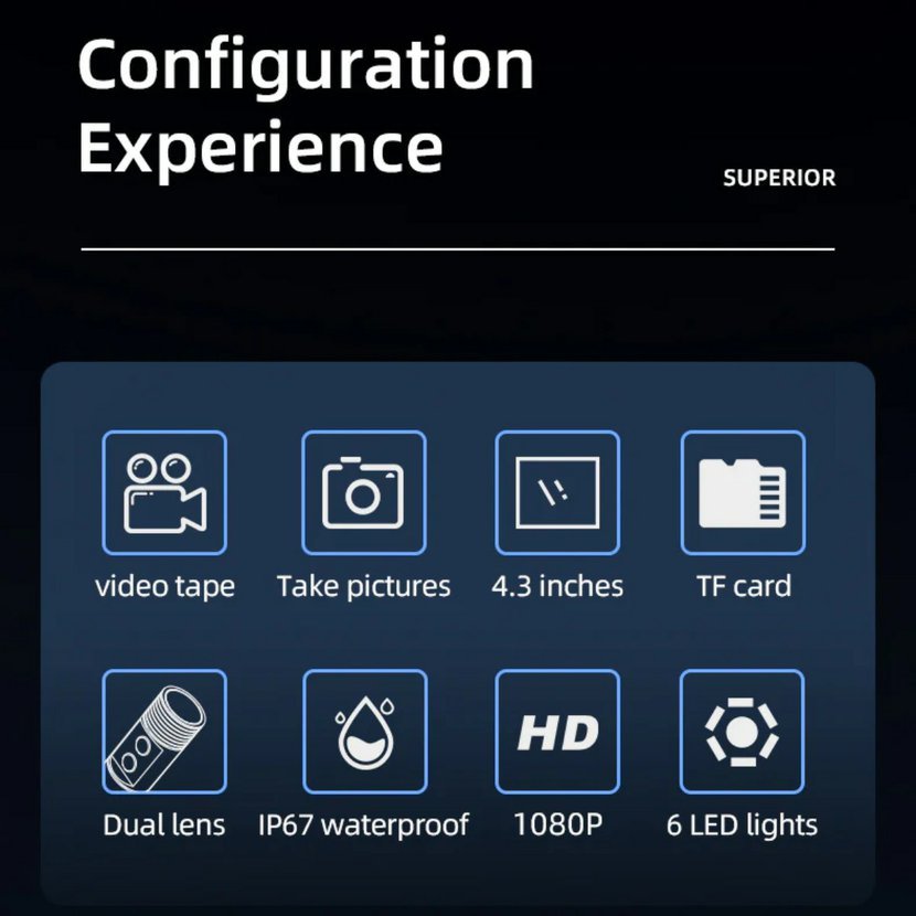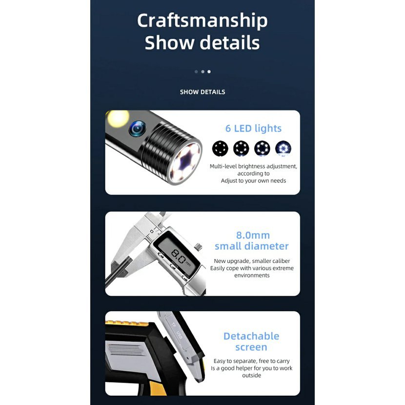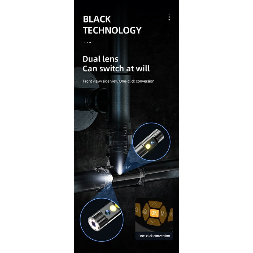 Na rozdíl od levnějších USB nebo Wi-Fi endoskopů je model WSNF112-2 vybaven vlastním displejem, takže nepotřebujete žádný telefon ani aplikaci. Obraz máte ihned k dispozici a můžete rovnou ukládat fotografie i videa na SD kartu. Duální kamera navíc umožňuje pohled zepředu i z boku, což zásadně zjednodušuje orientaci v potrubí nebo stísněném prostoru. Boční kamera nahrazuje klasické zrcátko – nic nemusíte dodatečně nasazovat.