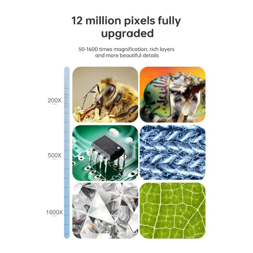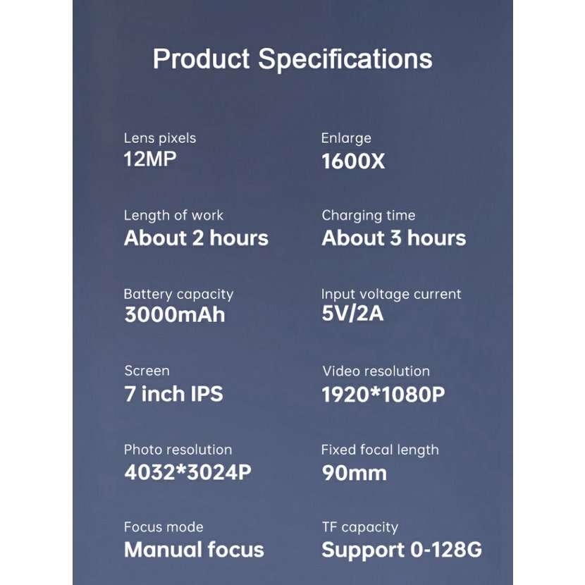 9" LCD mikroskop s 12 Mpx snímačem, videem 1080p, 30 fps, zvětšením až 1600× a stabilním kovovým stativem, napájení z baterie 3000 mAh nebo USB.