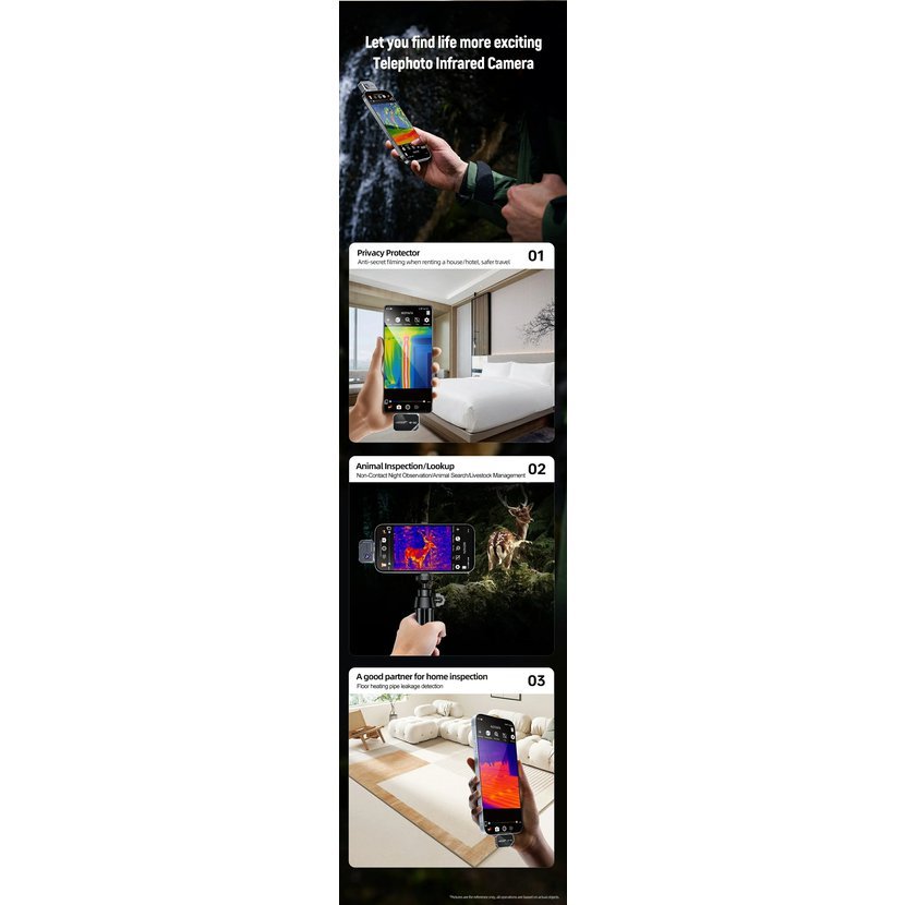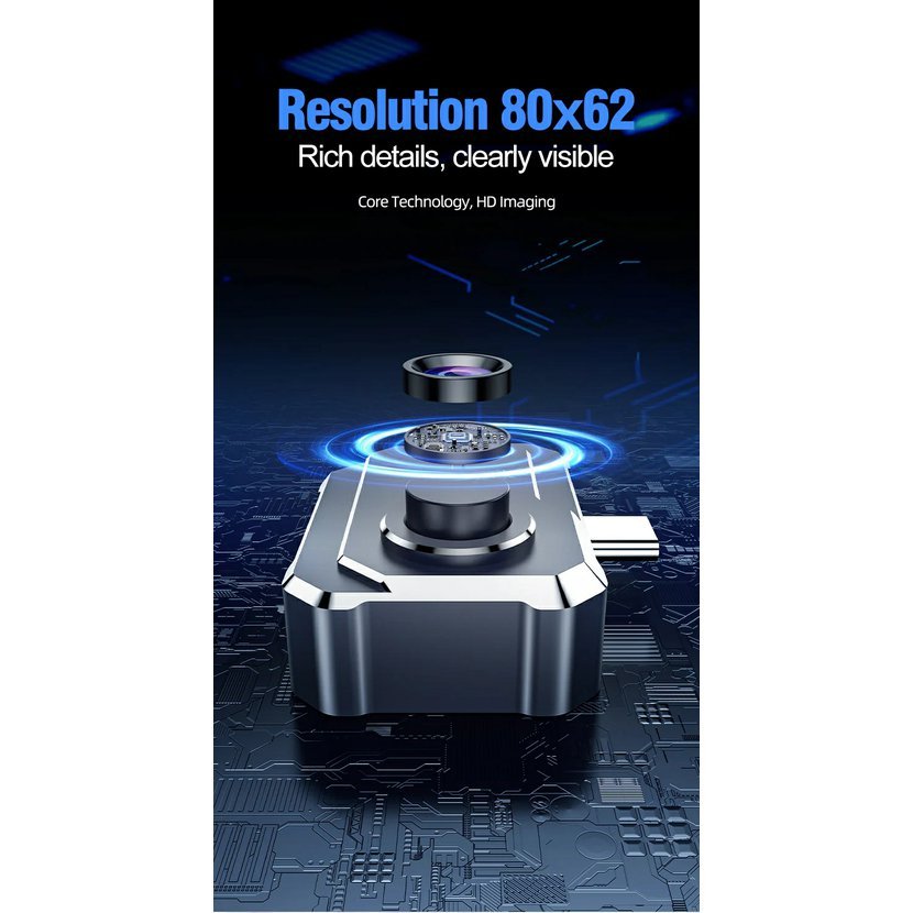 Rozlišení senzoru: 80 × 62 px (termální obraz) – standardní kategorie pro orientační měření, HD zobrazení na displeji telefonu