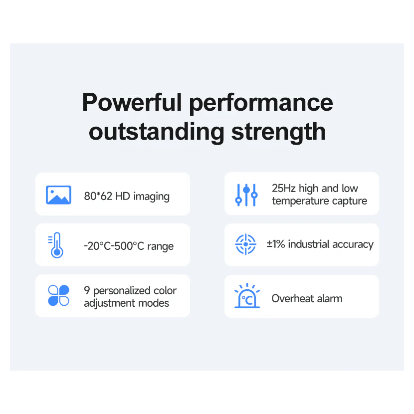 Kompaktní termokamera s rozlišením 80×62 px, AI filtrem pro čistý obraz a rozsahem 20 °C až 500 °C. Nabízí tři režimy měření (bodové, krátká a dlouhá vzdálenost), 9 barevných palet, přesnost ±2 °C/±2 % a USB-C připojení. Díky hmotnosti jen 20 g a odolnosti IP53 je ideální pro inspekce v terénu i v dílně.