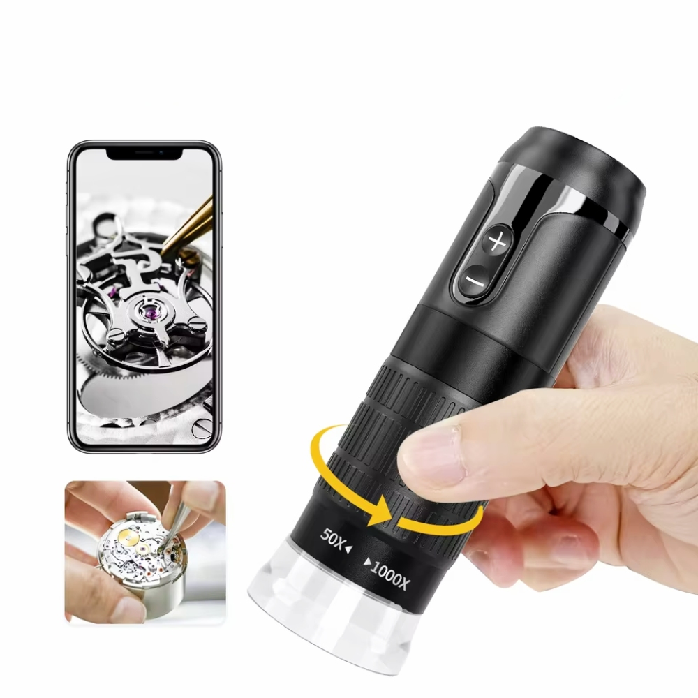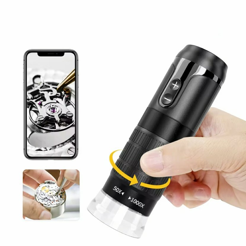 Digitální WiFi mikroskop bez stativu se zvětšením 50x–1000x a HD rozlišením 1280 x 720 px. Připojení přes WiFi nebo USB, 8 LED diod s regulací a vestavěná baterie 800 mAh z něj dělají ideální nástroj pro rychlé kontroly v terénu, sběratelství, výuku i servis elektroniky.