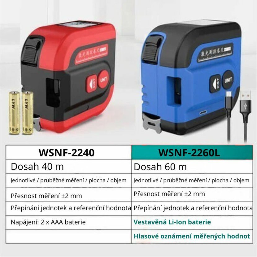 Model WSNF-2260L nabízí delší měřicí vzdálenost 60 m místo 40 m, vestavěnou dobíjecí baterii místo klasických AAA článků a navíc disponuje hlasovým výstupem v angličtině. Oproti WSNF-2240 také umožňuje pohodlnější práci díky audio oznámení výsledků, takže při měření nemusíte sledovat displej. Základní funkce, přesnost a ovládací logika zůstávají podobné, takže přechod mezi modely je velmi snadný.