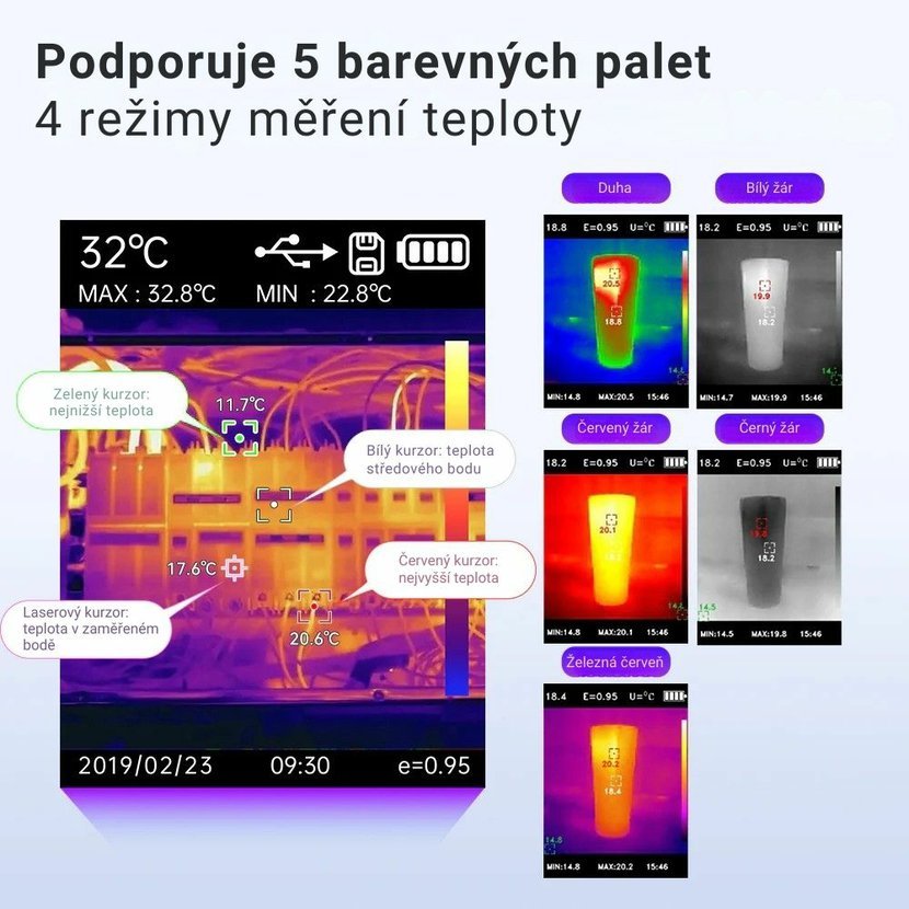 - Barevné palety: Duha, Železná červeň, Červený žár, Bílý žár, Černý žár